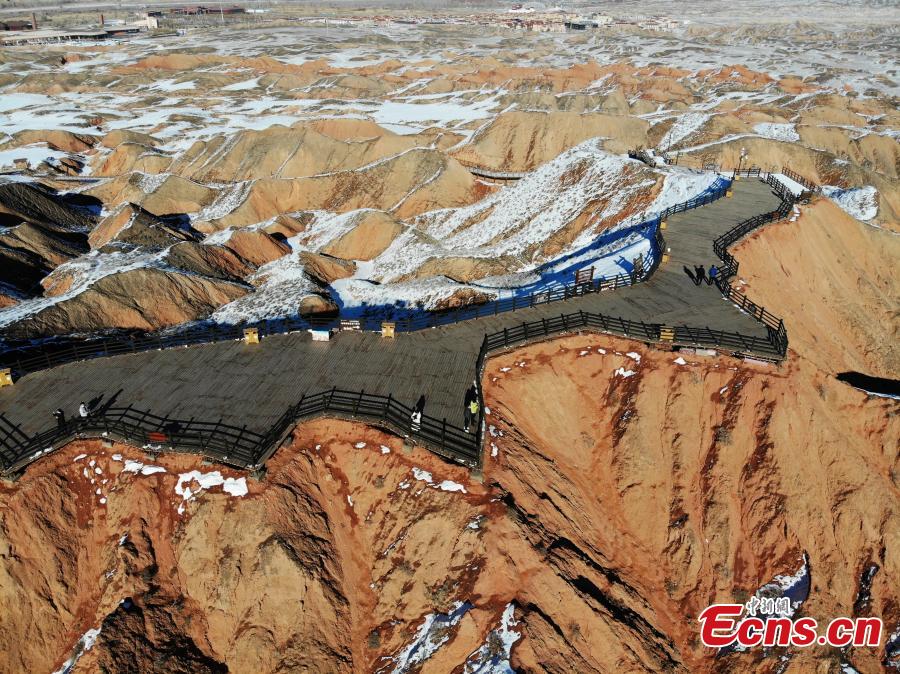 Photo taken on Nov. 29, 2021 shows the Danxia National Geological Park after snowfall, Zhangye City, northwest China's Gansu Province. (Photo: China News Service/Zhang Yanmin)