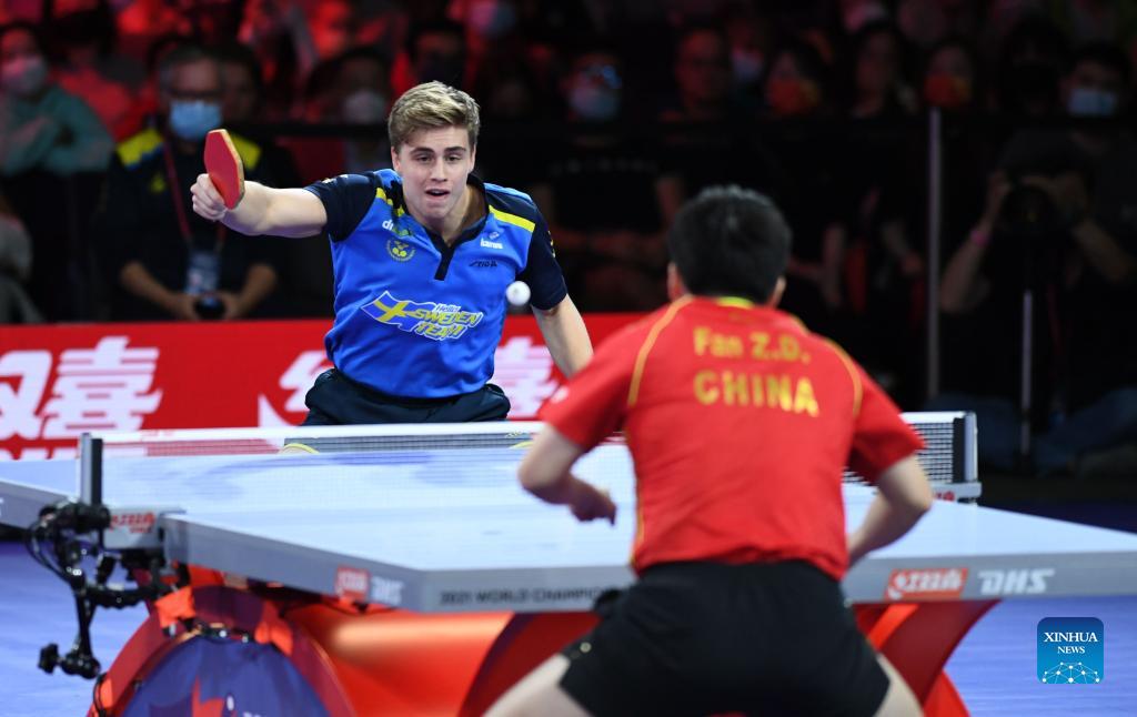 Truls Moregard (L) of Sweden competes during the men's singles final match between Fan Zhendong of China and Truls Moregard of Sweden at 2021 World Table Tennis Championships Finals in Houston, the United States on Nov. 29, 2021. (Xinhua/Wu Xiaoling)
