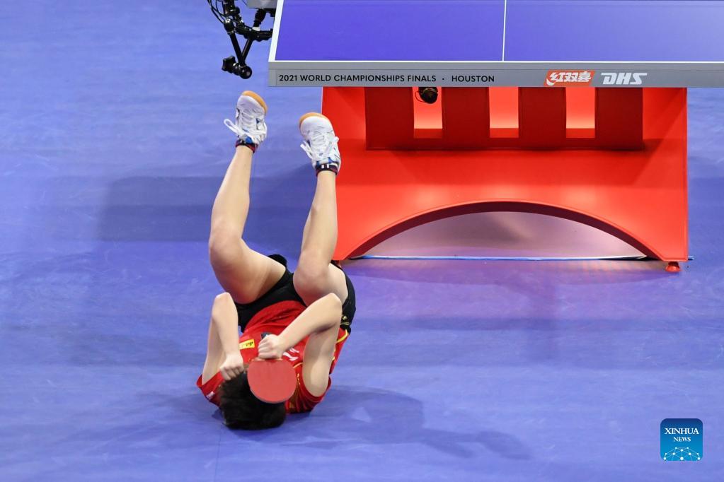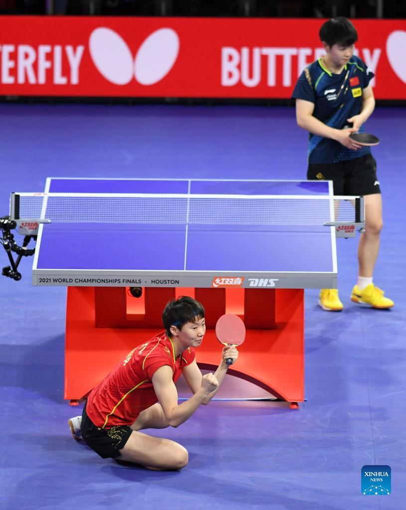 China's Wang Manyu celebrate after winning the women's sinlges final match against her teammate Sun Yingsha at 2021 World Table Tennis Championships Finals in Houston, the United States on Nov. 29, 2021. (Xinhua/Wu Xiaoling)