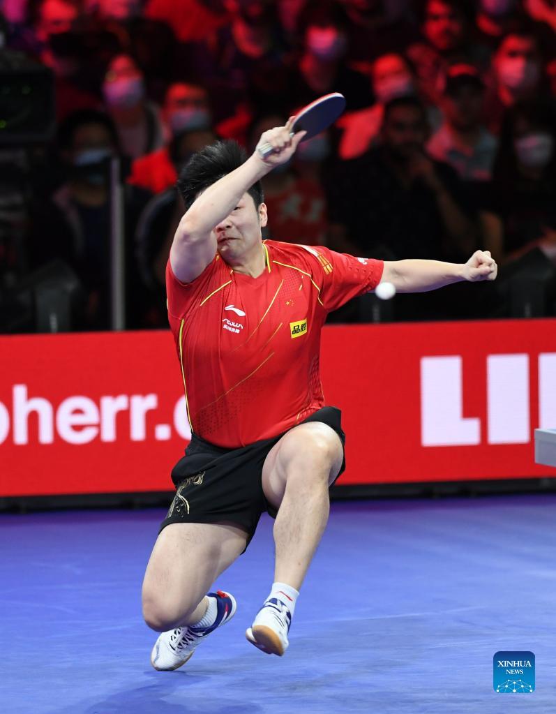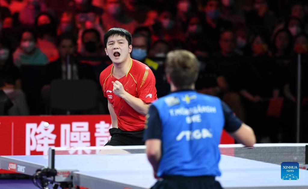 Fan Zhendong of China competes during the men's singles final match between Fan Zhendong of China and Truls Moregard of Sweden at 2021 World Table Tennis Championships Finals in Houston, the United States on Nov. 29, 2021. (Xinhua/Wu Xiaoling)