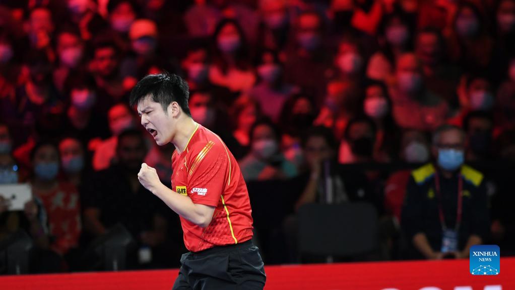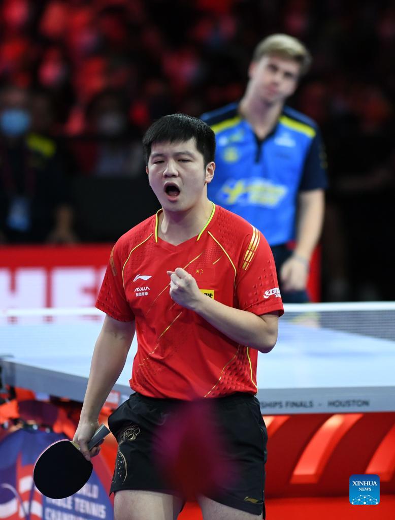 Fan Zhendong of China celebrates during the men's singles final match between Fan Zhendong of China and Truls Moregard of Sweden at 2021 World Table Tennis Championships Finals in Houston, the United States on Nov. 29, 2021. (Xinhua/Wu Xiaoling)