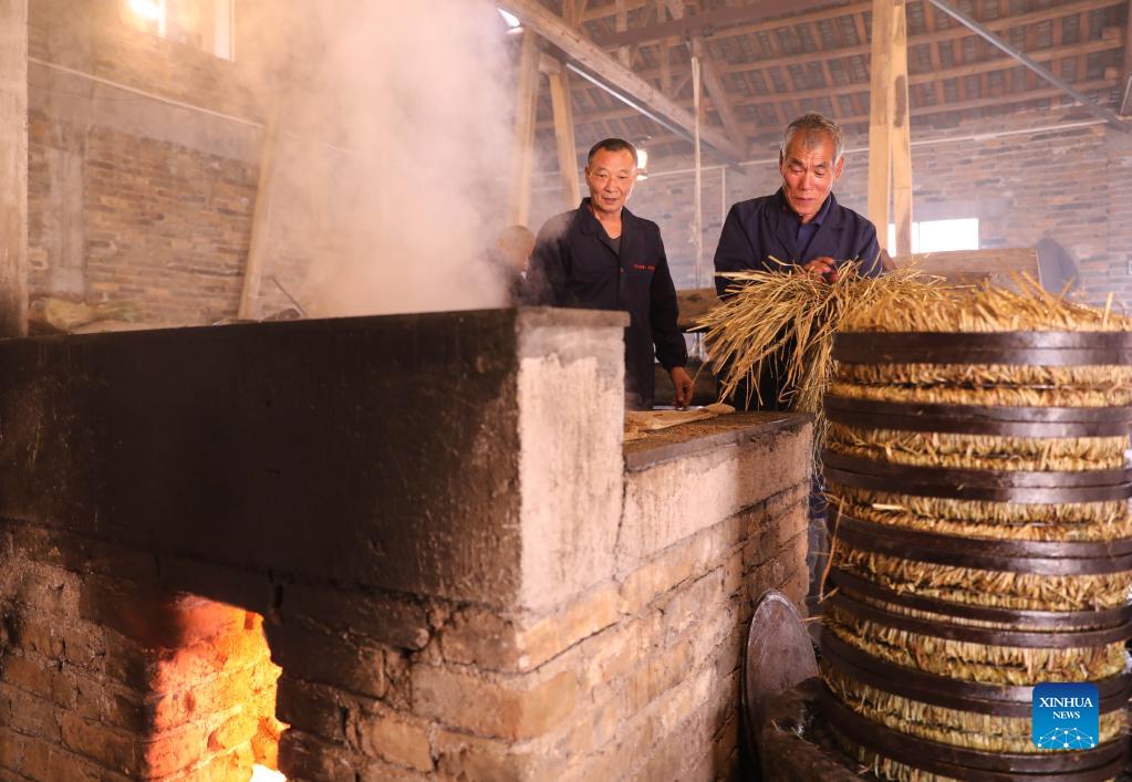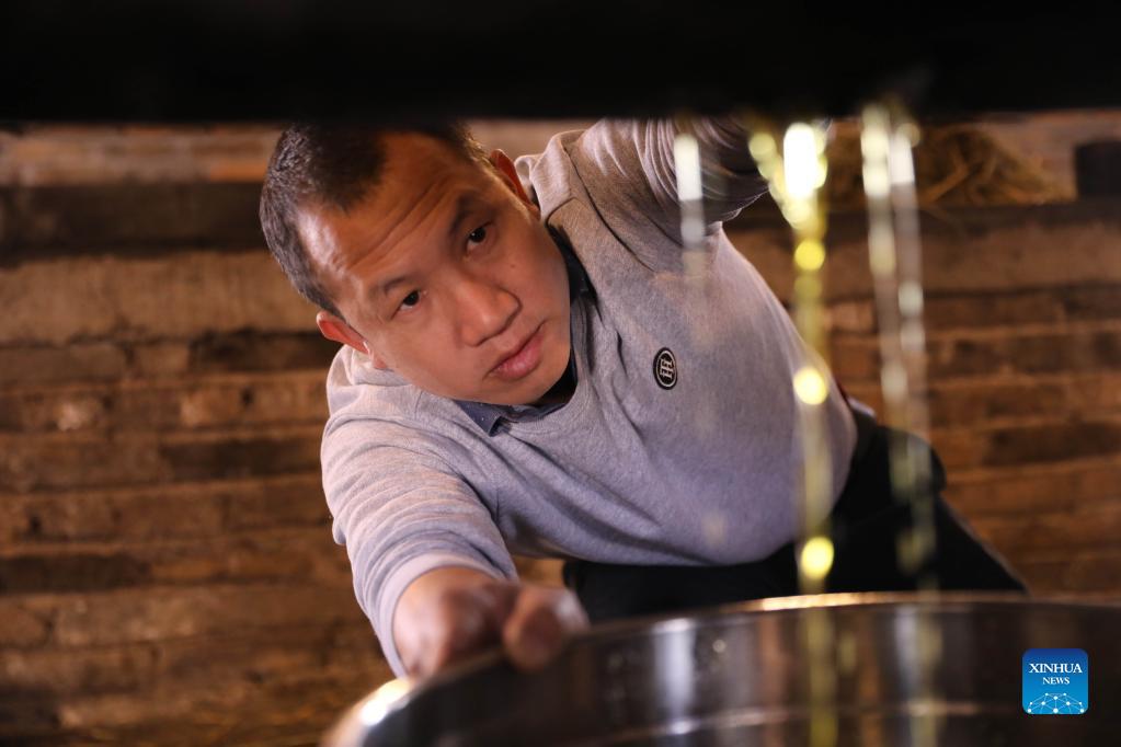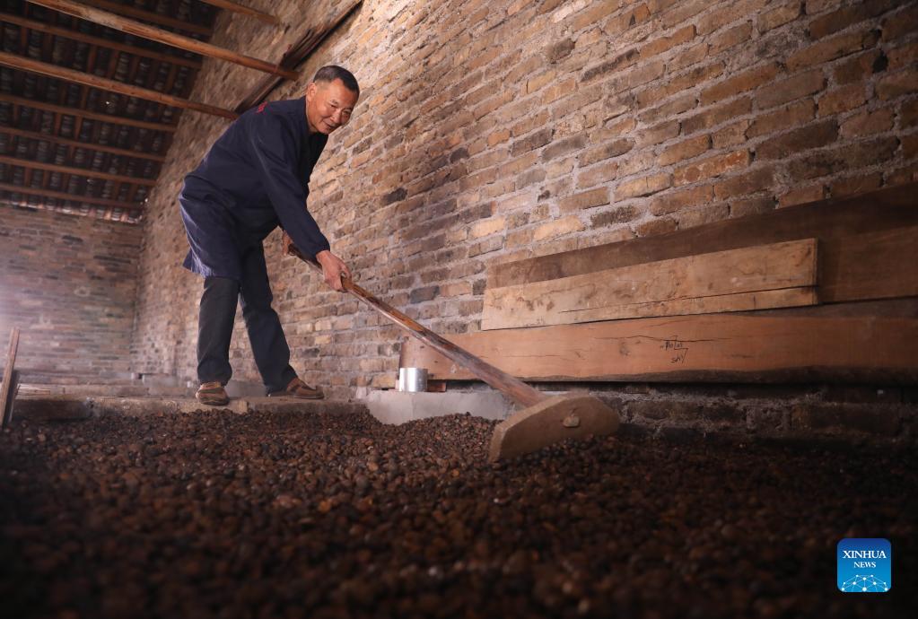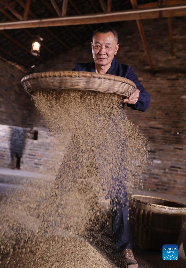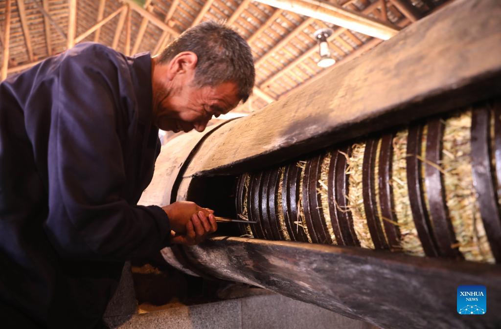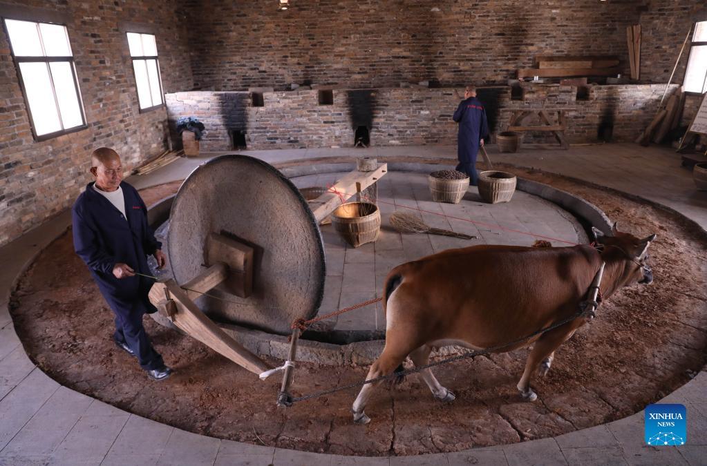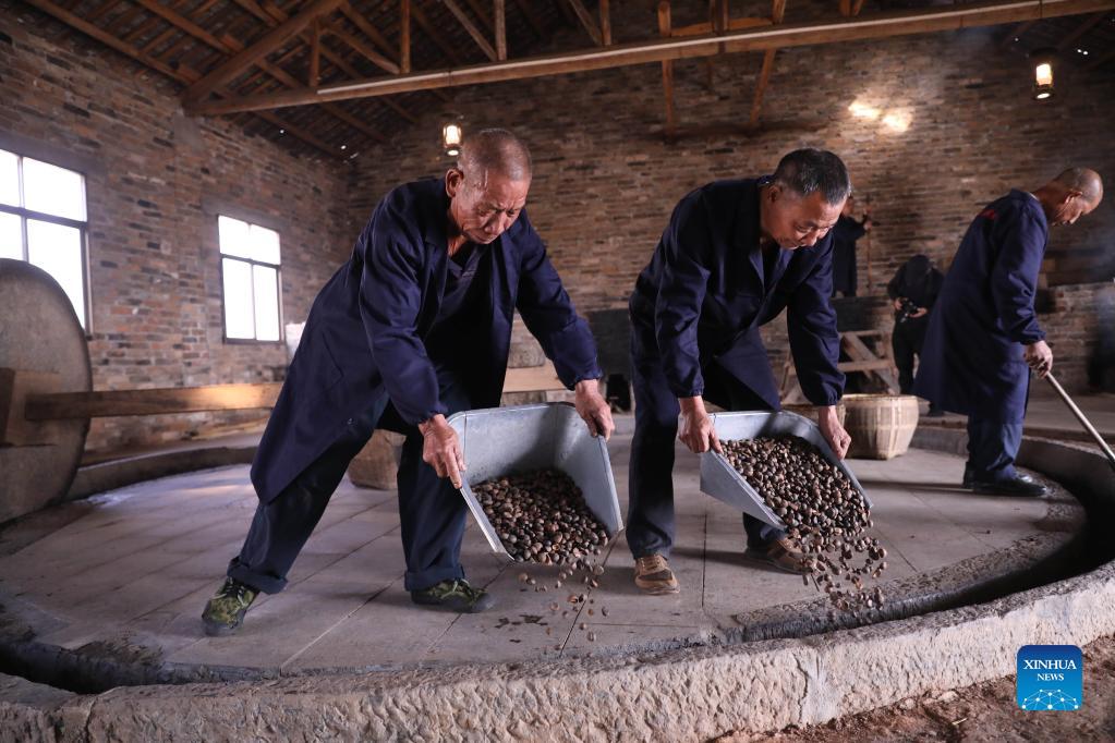 Traditional way of extracting Camellia oil is retained in Shangdu Village of Daoxian County, central China’s Hunan Province. Local villagers dry seeds, grind powder and make tea cakes, using a traditional spring press and precipitation filtration process. Once ready, the golden tea oil is supplied to local markets. (Xinhua/He Hongfu)