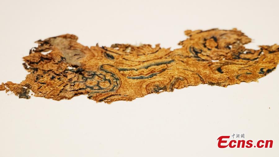 Brocade unearthed from Reshui graveyard site is displayed at the Qinghai Province Museum in Xining, northwest China's Qinghai Province, Nov. 29, 2021. (Photo: China News Service/Ma Mingyan)