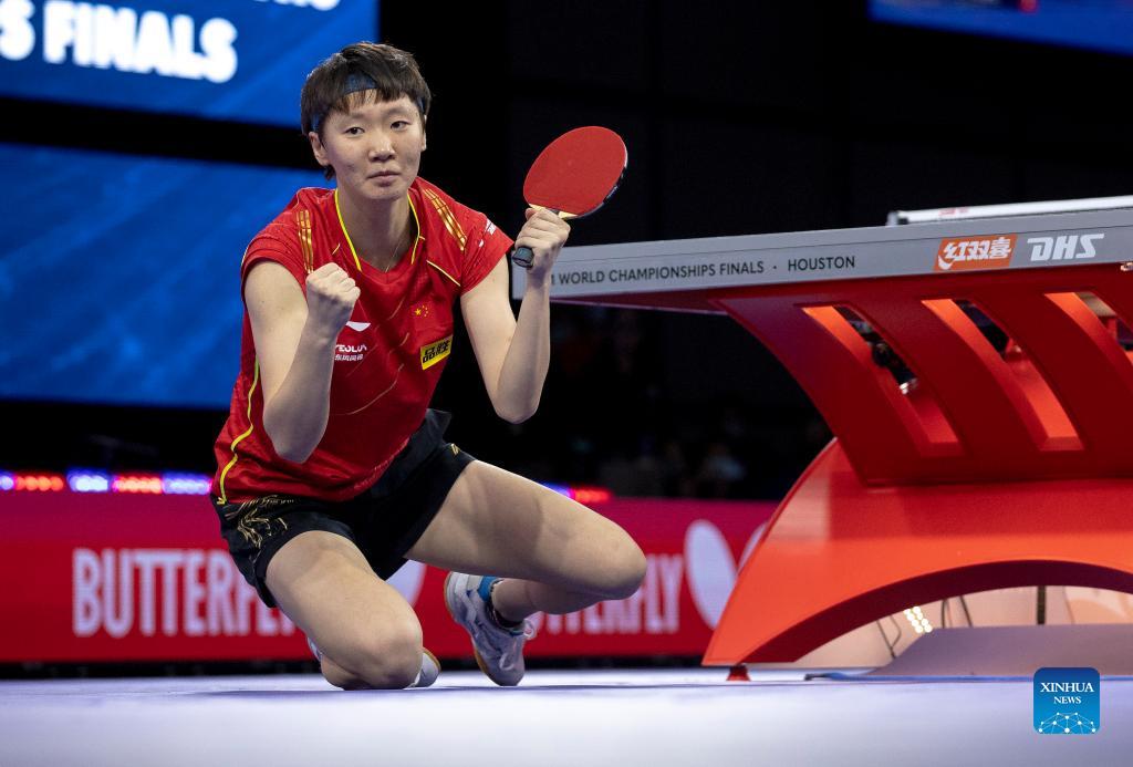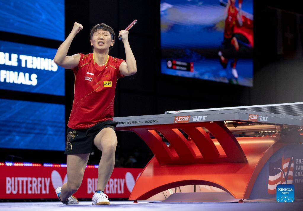 China's Wang Manyu celebrates during the women's sinlges final match between Wang Manyu of China and her teammate Sun Yingsha at 2021 World Table Tennis Championships Finals in Houston, the United States on Nov. 29, 2021. (Photo by Nick Wagner/Xinhua)