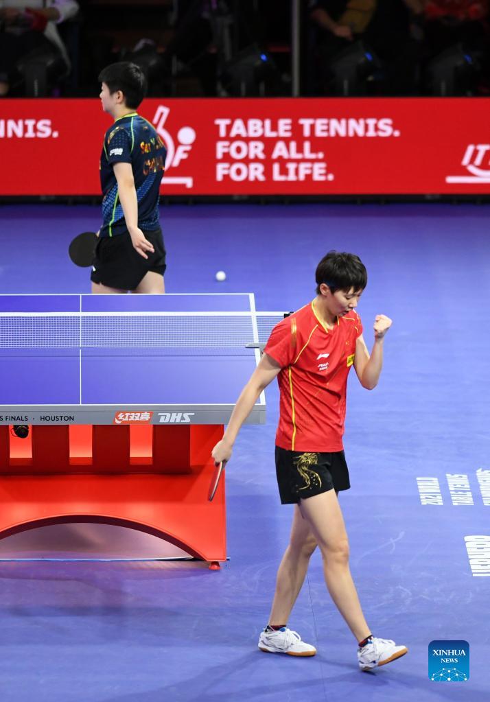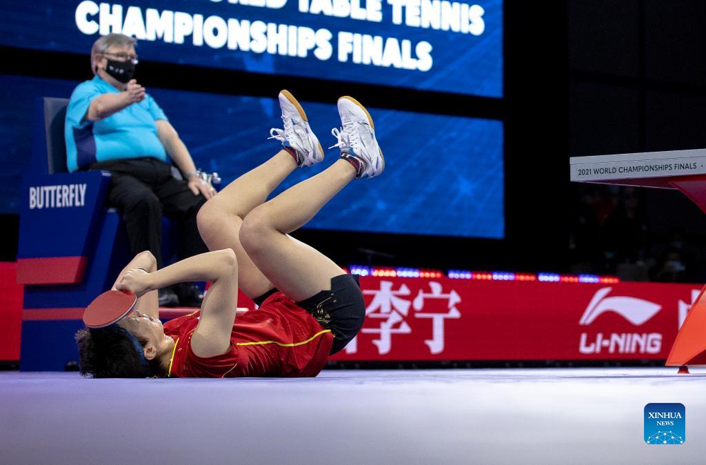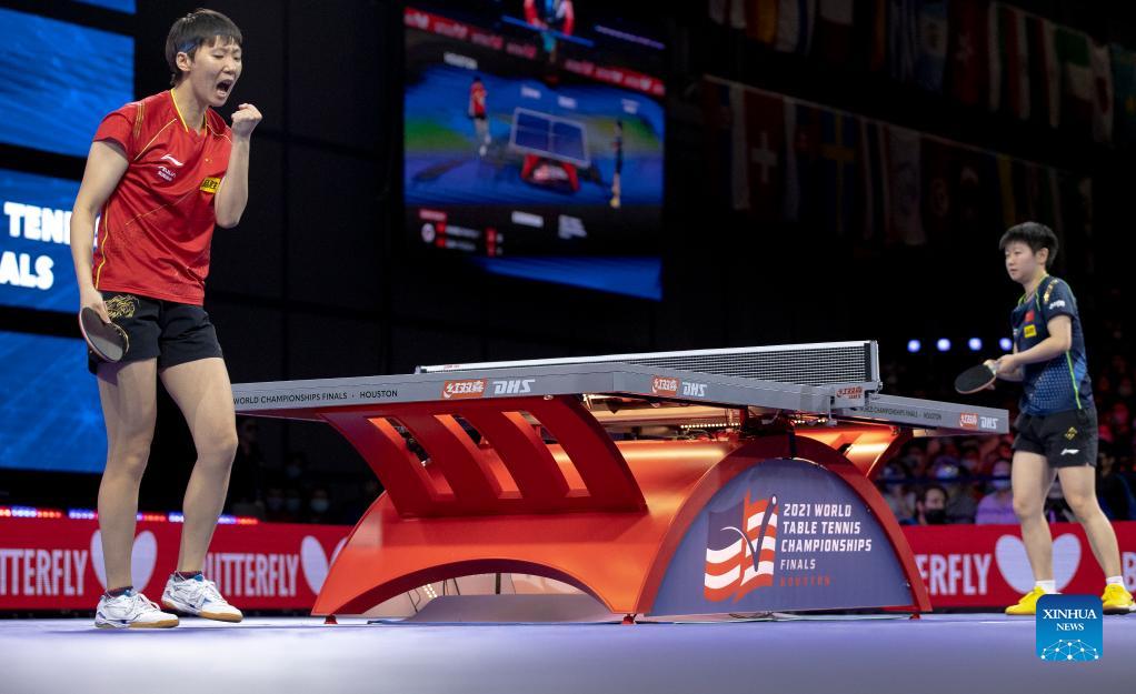 China's Wang Manyu (R) celebrates during the women's sinlges final match between Wang Manyu of China and her teammate Sun Yingsha at 2021 World Table Tennis Championships Finals in Houston, the United States on Nov. 29, 2021. (Xinhua/Wu Xiaoling)