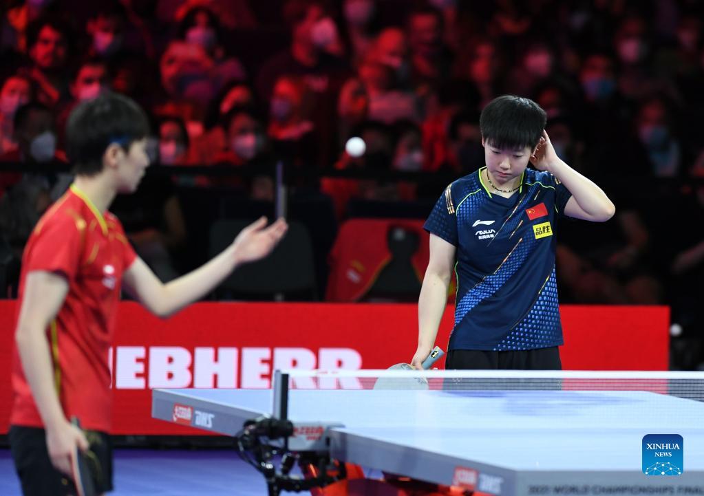 China's Sun Yingsha (R) reacts during the women's sinlges final match between Wang Manyu of China and her teammate Sun Yingsha at 2021 World Table Tennis Championships Finals in Houston, the United States on Nov. 29, 2021. (Xinhua/Wu Xiaoling)