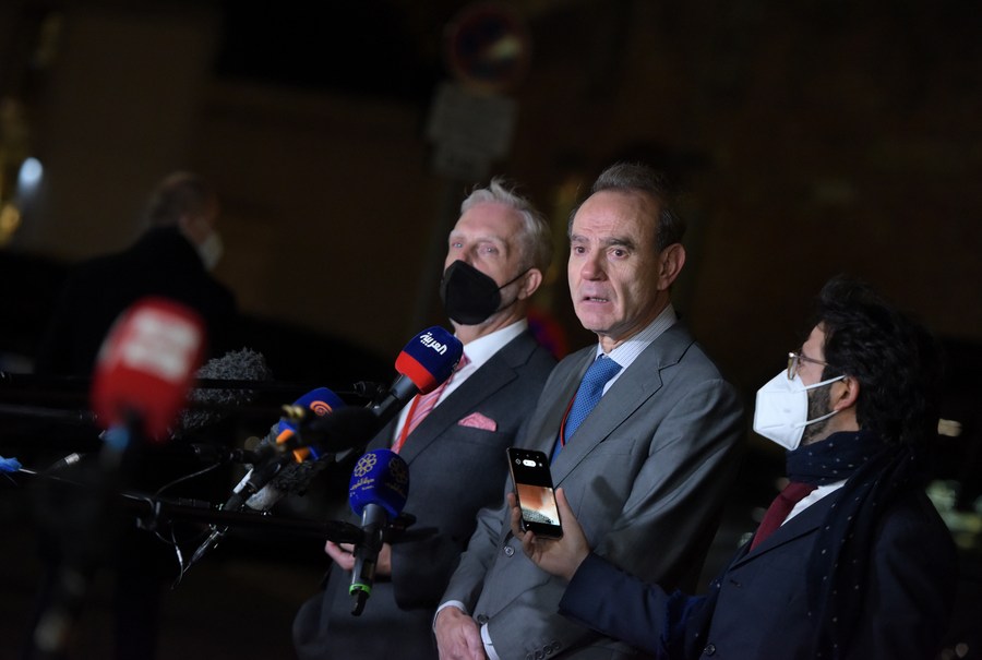 Enrique Mora (2nd R), deputy secretary-general of the European External Action Service, speaks to reporters after a meeting of the Joint Comprehensive Plan of Action (JCPOA) Joint Commission in Vienna, Austria, on Nov. 29, 2021.(Xinhua/Guo Chen)