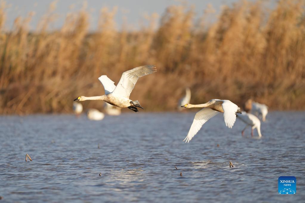 Two swans fly over the Wuxing white crane conservation area by the Poyang Lake in Nanchang, east China's Jiangxi Province, Nov. 30, 2021. Numerous migratory birds including white cranes and swans have arrived in the wetland by the Poyang Lake, taking it as their winter habitat. (Xinhua/Zhou Mi)