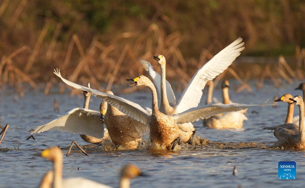 Swans are seen at the Wuxing white crane conservation area by the Poyang Lake in Nanchang, east China's Jiangxi Province, Nov. 30, 2021. Numerous migratory birds including white cranes and swans have arrived in the wetland by the Poyang Lake, taking it as their winter habitat. (Xinhua/Zhou Mi)