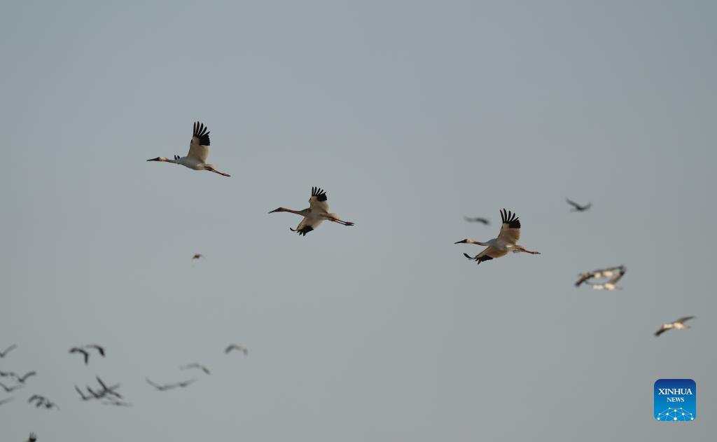 Migrant birds fly over the Wuxing white crane conservation area by the Poyang Lake in Nanchang, east China's Jiangxi Province, Nov. 30, 2021. Numerous migratory birds including white cranes and swans have arrived in the wetland by the Poyang Lake, taking it as their winter habitat. (Xinhua/Zhou Mi)