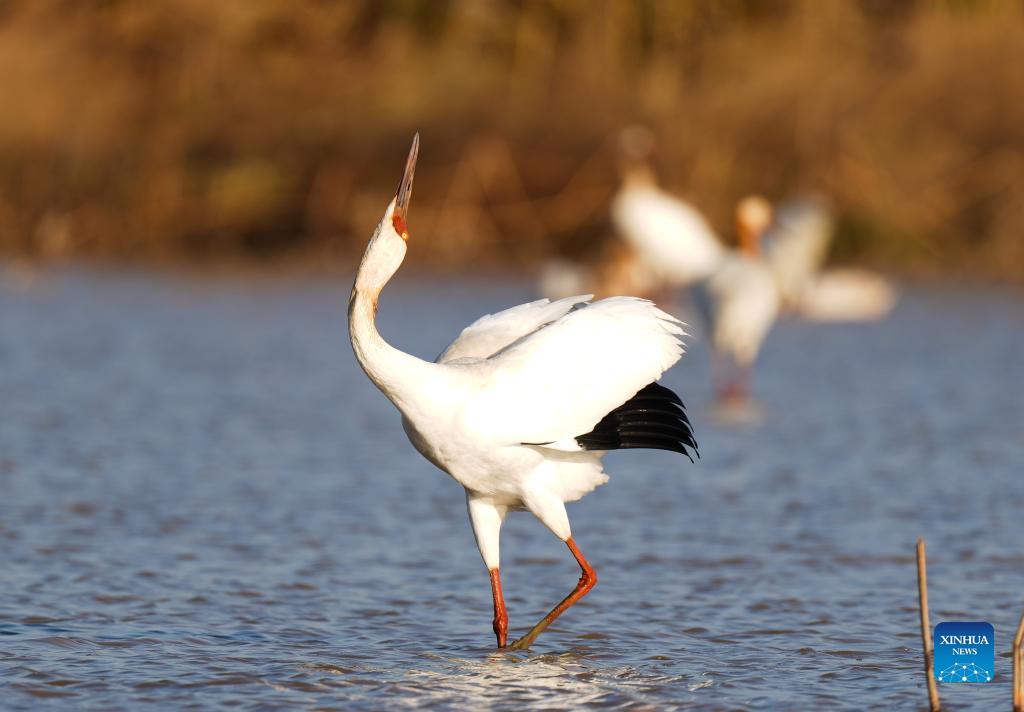 A white crane is seen at the Wuxing white crane conservation area by the Poyang Lake in Nanchang, east China's Jiangxi Province, Nov. 30, 2021. Numerous migratory birds including white cranes and swans have arrived in the wetland by the Poyang Lake, taking it as their winter habitat. (Xinhua/Zhou Mi)