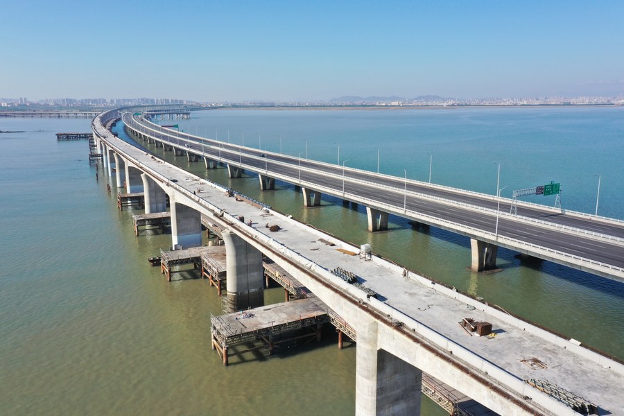 FUZHOU, Nov. 30 (Xinhua) -- The main structure of the Quanzhou Bay cross-sea bridge, part of the 277-km Fuzhou-Xiamen high-speed railway, was completed Tuesday. The bridge is 20.29 km long in total, with its sea bridge measuring 8.96 km in length.