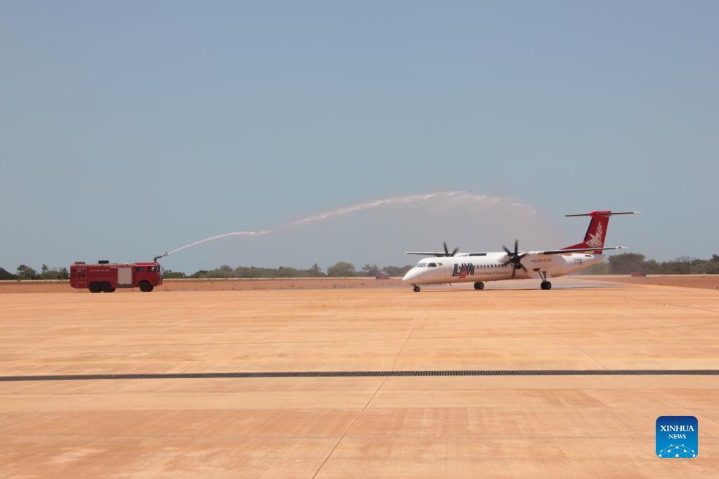 The first landed airplane passes the water gate during the inauguration ceremony of a provincial airport financed by the Chinese government in Gaza province, Mozambique, Nov. 29, 2021. Mozambican President Filipe Nyusi on Monday inaugurated a provincial airport in the southern province of Gaza, which was financed by the Chinese government. (Xinhua/Nie Zuguo)