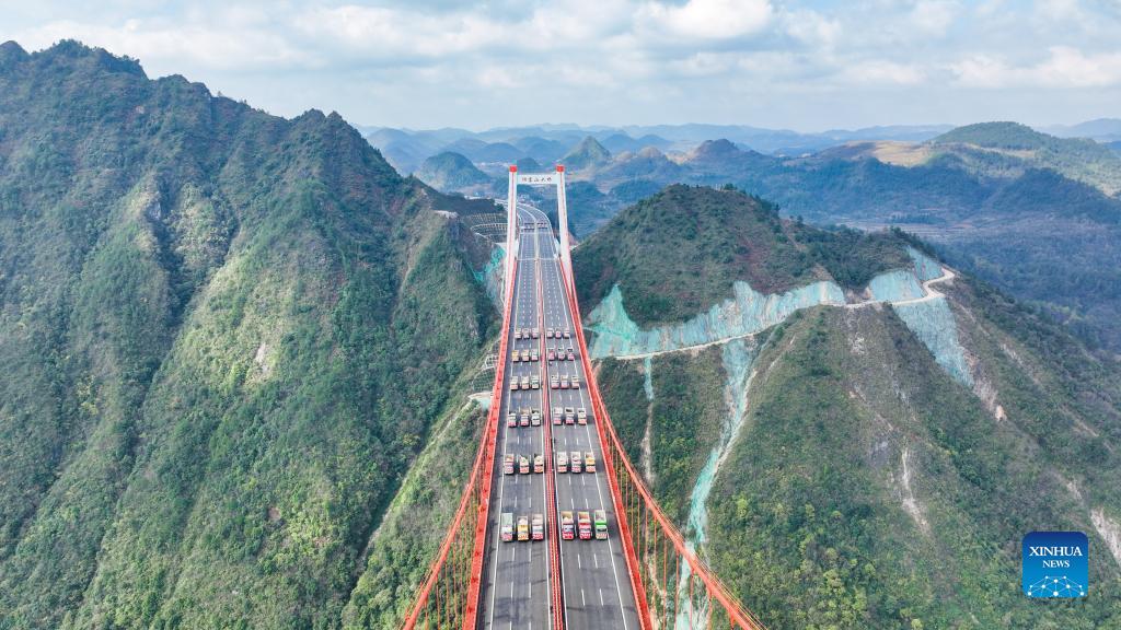 Aerial photo taken on Nov. 30, 2021 shows the Yangbaoshan bridge during a static load test in Guiding County, southwest China's Guizhou Province. The Yangbaoshan bridge carried out a static load test on Tuesday. Forty-eight large trucks with a total of 1,680 tonnes of goods were parked on the bridge to test the construction quality and mechanical properties of the bridge structure. With a main span of 650 meters, the grand bridge, which is a part of the Guiyang-Huangping Highway, stretches 1,112 meters in length. (Xinhua/Deng Gang)