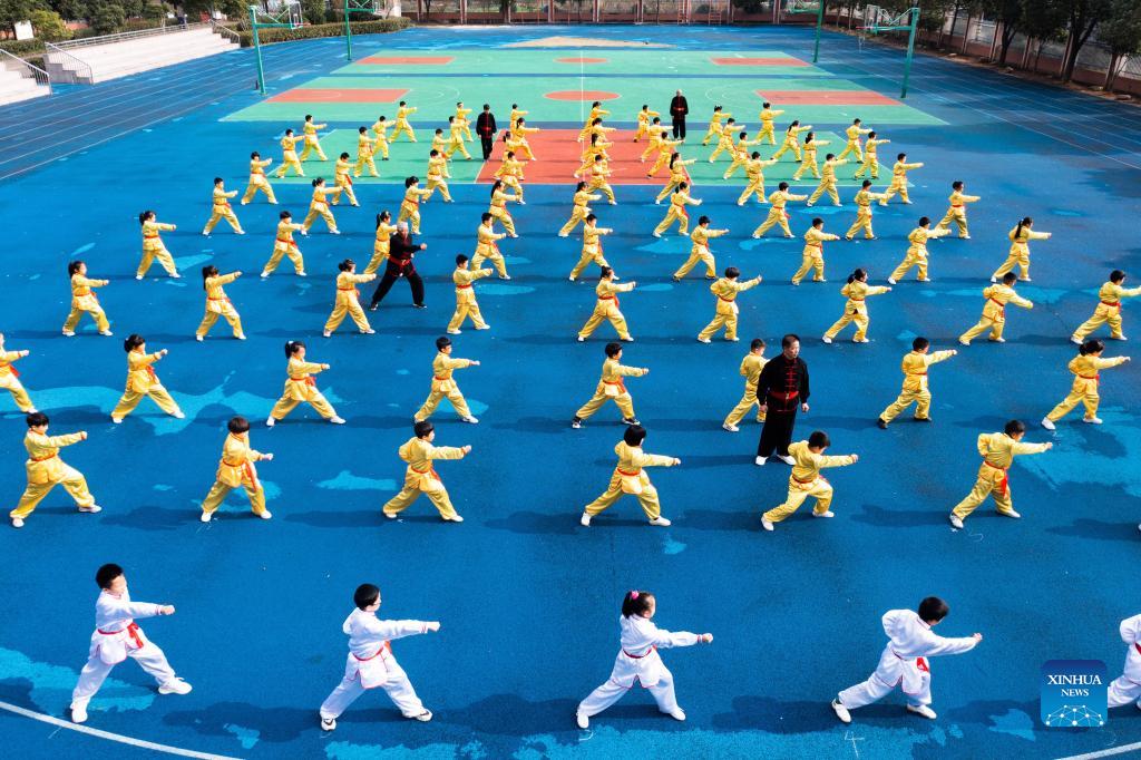 Photo taken on Nov. 30, 2021 shows students practising martial arts under the guidance of an inheritor of intangible cultural heritage in Zhaojiazhen Central Primary School in Zhuji city, east China's Zhejiang Province.This kind of martial art has a long history in Zhuji City and was included in the list of intangible cultural heritages in 2012. Zhejiang Province has introduced the martial arts lessons in line with the "double reduction" policy to ease the burden of excessive homework and off-campus tutoring for students undergoing compulsory education. (Xinhua/Xu Li)
