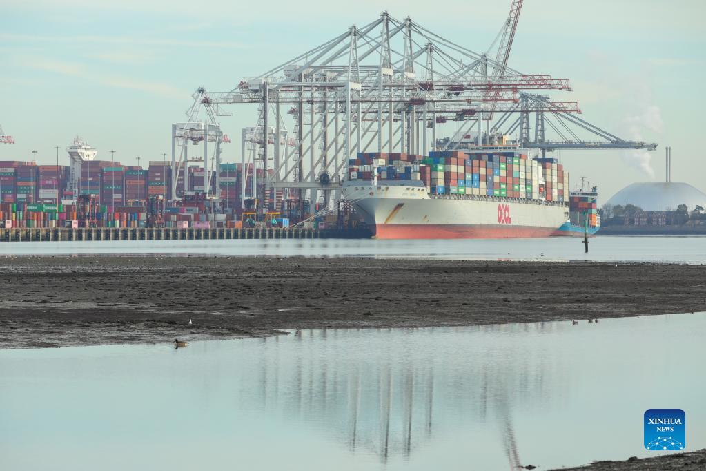 Photo taken on Nov. 29, 2021 shows shipping containers and a ship at Southampton Port in Southampton, Britain. Consumers across Britain are expected to face higher prices and fewer choices for goods this Christmas season due to supply chain delays and soaring inflation. (Photo by Tim Ireland/Xinhua)