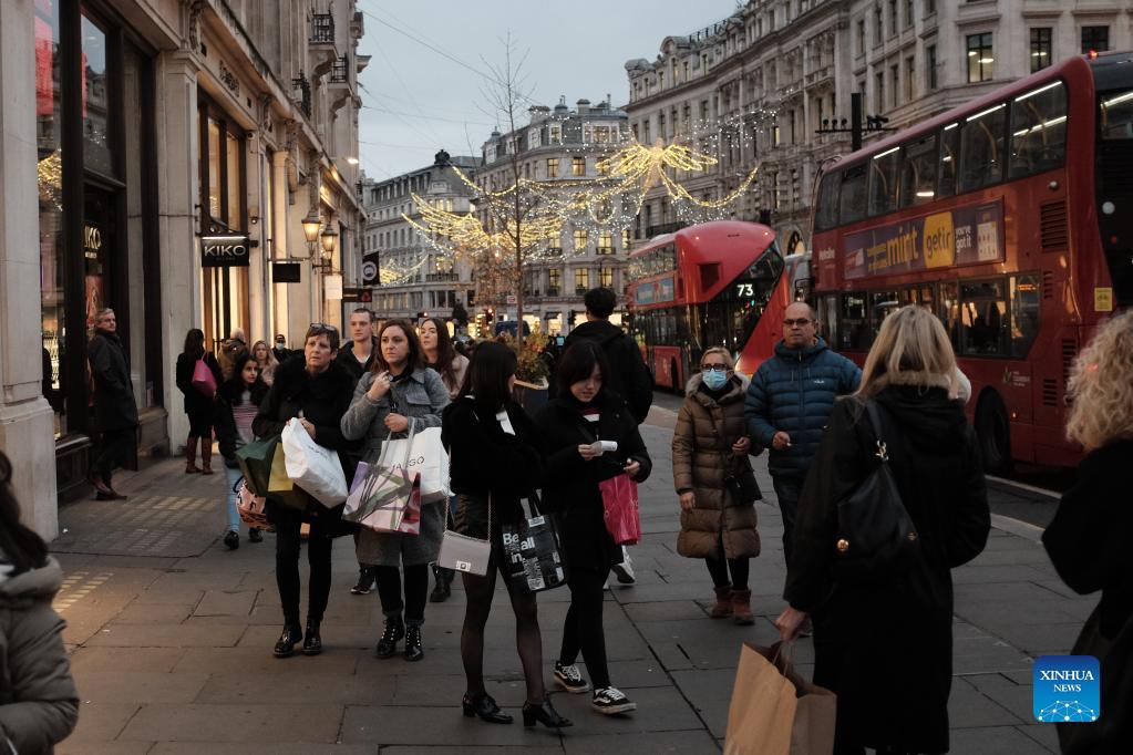 People with shopping bags walk on Regent Street in London, Britain, Nov. 24, 2021. Consumers across Britain are expected to face higher prices and fewer choices for goods this Christmas season due to supply chain delays and soaring inflation. (Photo by Tim Ireland/Xinhua)