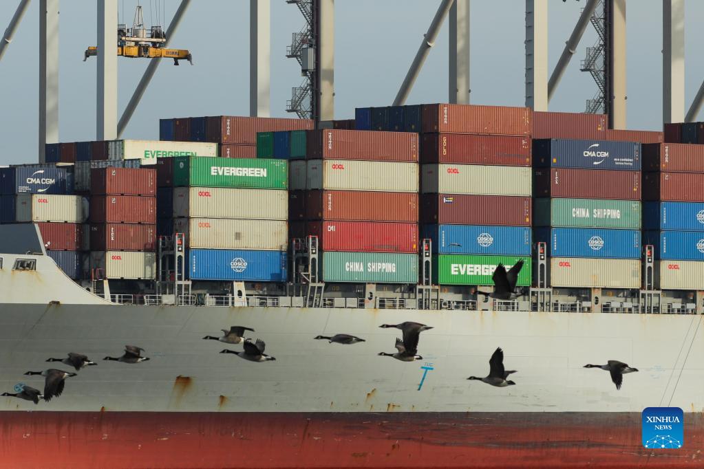 Photo taken on Nov. 29, 2021 shows shipping containers and a ship at Southampton Port in Southampton, Britain. Consumers across Britain are expected to face higher prices and fewer choices for goods this Christmas season due to supply chain delays and soaring inflation. (Photo by Tim Ireland/Xinhua)