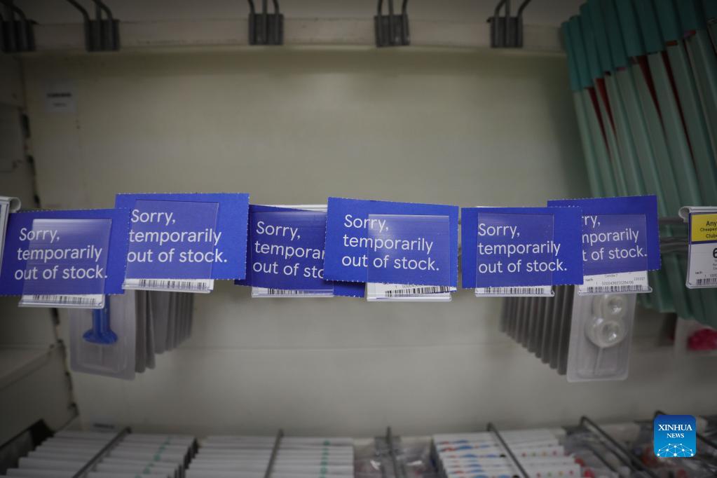 Photo taken on Nov. 24, 2021 shows signs of products out of stock at a store in London, Britain. Consumers across Britain are expected to face higher prices and fewer choices for goods this Christmas season due to supply chain delays and soaring inflation. (Photo by Tim Ireland/Xinhua)