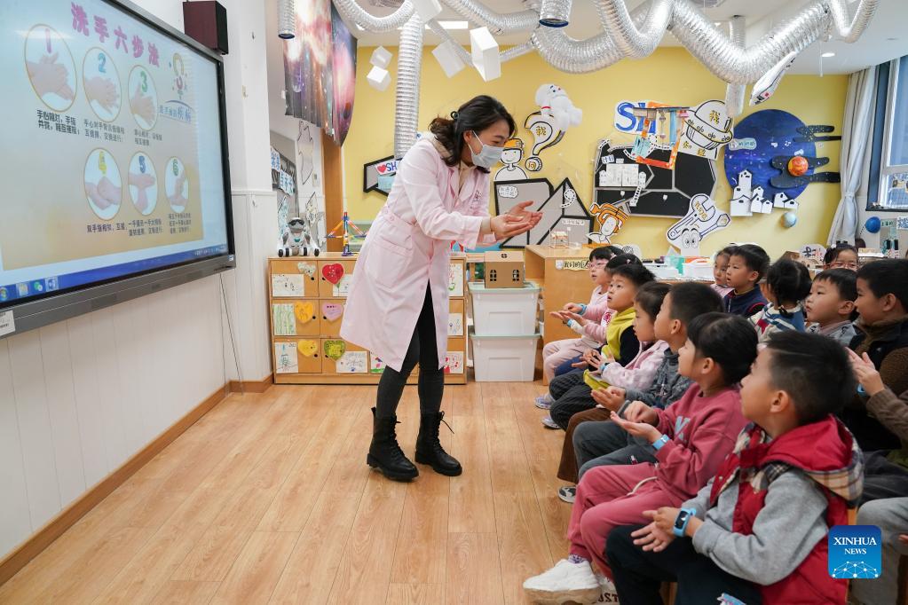 A kindergarten in Xuhui District of east China's Shanghai teaches children campus disinfection, preparedness and other epidemic prevention measures, in order to improve health and hygiene and build a strong epidemic defense. (Xinhua/Ding Ting)