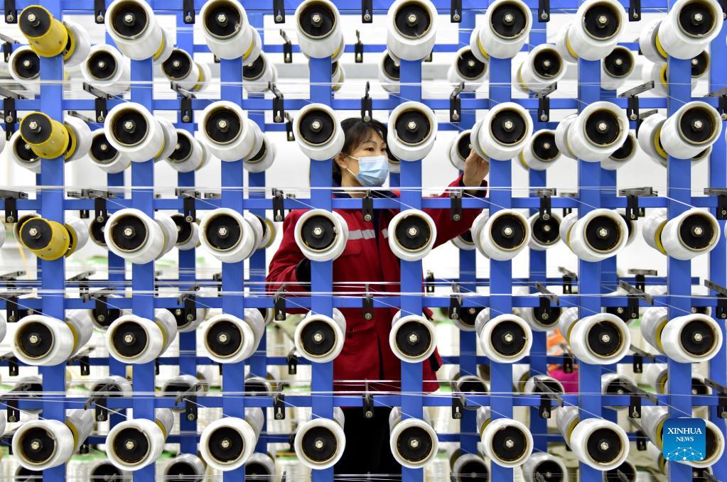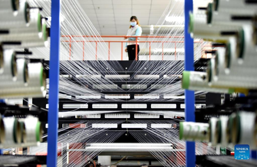 A staff member works at a cloth production workshop of a new material technology company in Fucheng County, Hengshui, north China's Hebei Province, Nov. 30, 2021. In recent years, Fucheng has taken scientific and technological innovation as a driving force to boost the economy of the county. (Xinhua/Zhu Xudong)