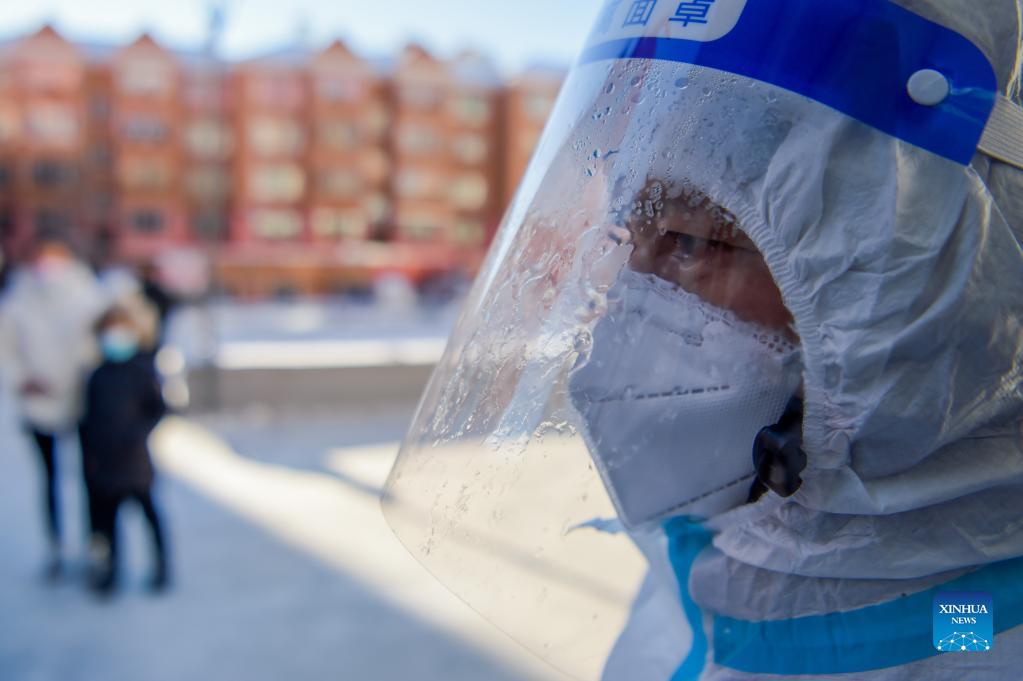 A medical worker works at a sampling site in Manzhouli, north China's Inner Mongolia Autonomous Region, Dec. 1, 2021. Manzhouli launched a fourth round of all-inclusive nucleic acid testing on Wednesday since new locally transmitted confirmed COVID-19 cases were reported. (Xinhua/Li Zhipeng)