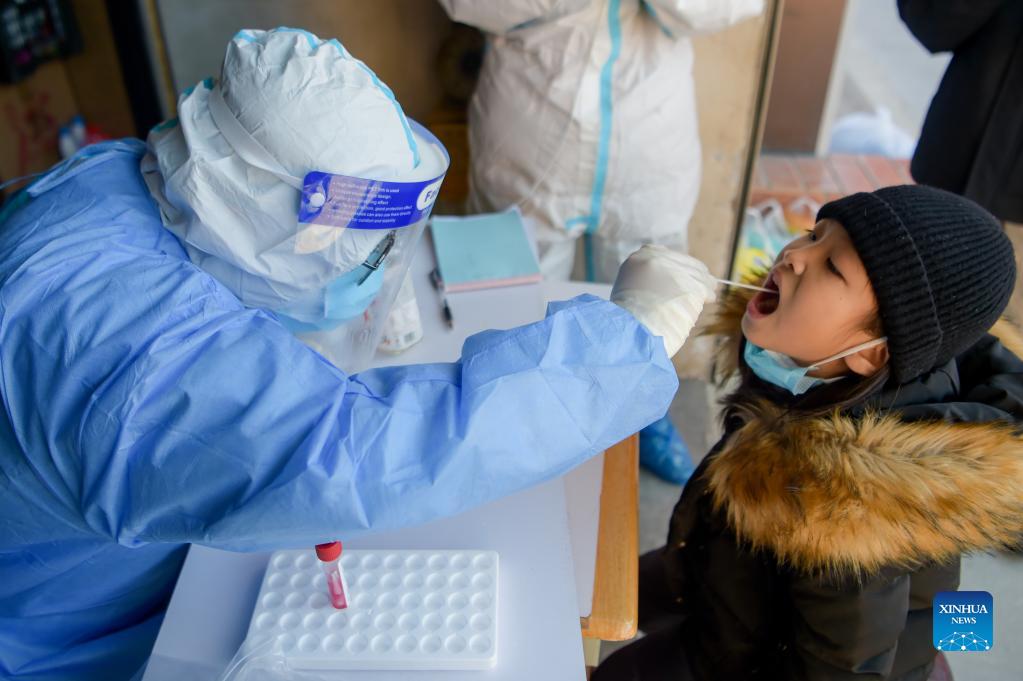 A medical worker takes a swab sample from a child for nucleic acid testing at a sampling site in Manzhouli, north China's Inner Mongolia Autonomous Region, Dec. 1, 2021. Manzhouli launched a fourth round of all-inclusive nucleic acid testing on Wednesday since new locally transmitted confirmed COVID-19 cases were reported. (Xinhua/Li Zhipeng)