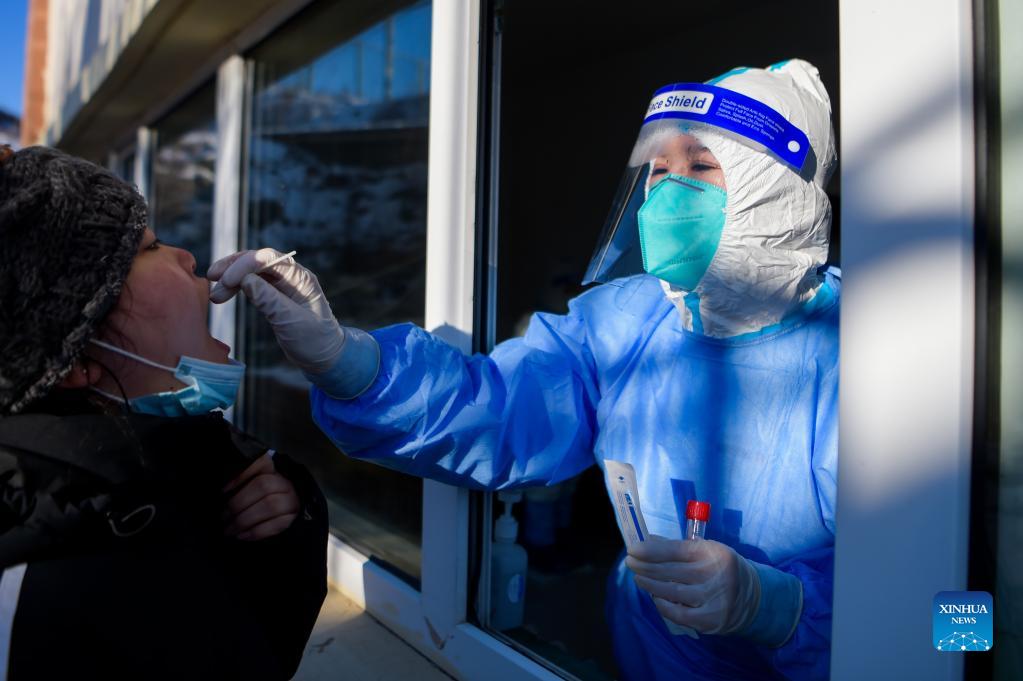 A medical worker takes a swab sample from a resident for nucleic acid testing at a sampling site in Manzhouli, north China's Inner Mongolia Autonomous Region, Dec. 1, 2021. Manzhouli launched a fourth round of all-inclusive nucleic acid testing on Wednesday since new locally transmitted confirmed COVID-19 cases were reported. (Xinhua/Li Zhipeng)