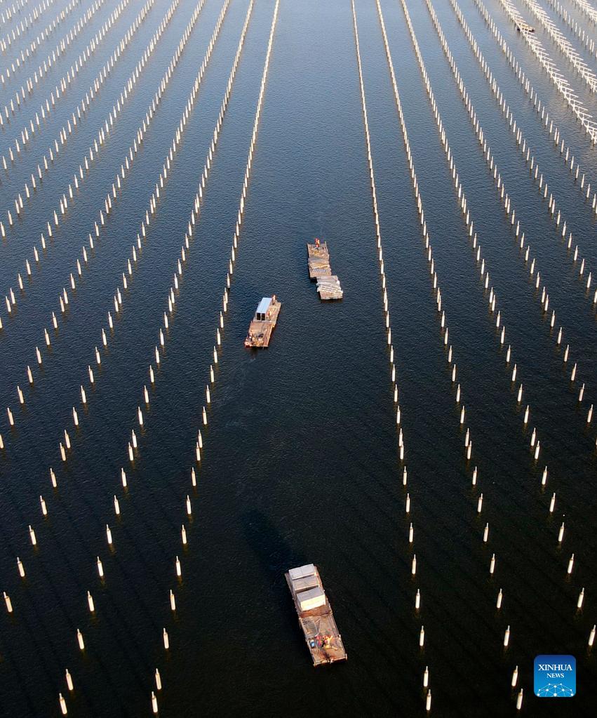 Aerial photo taken on Nov. 24, 2021 shows workers transferring panels of a photovoltaic (PV) power station at Jiangji reservoir in Hefei, east China's Anhui Province. A PV power station with a designed installed capacity of 50 megawatts at Jiangji reservoir in Hefei was successfully connected to the grid on Nov. 30. (Xinhua/Huang Bohan)