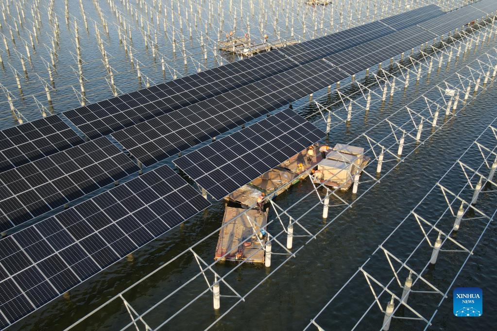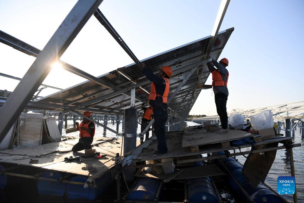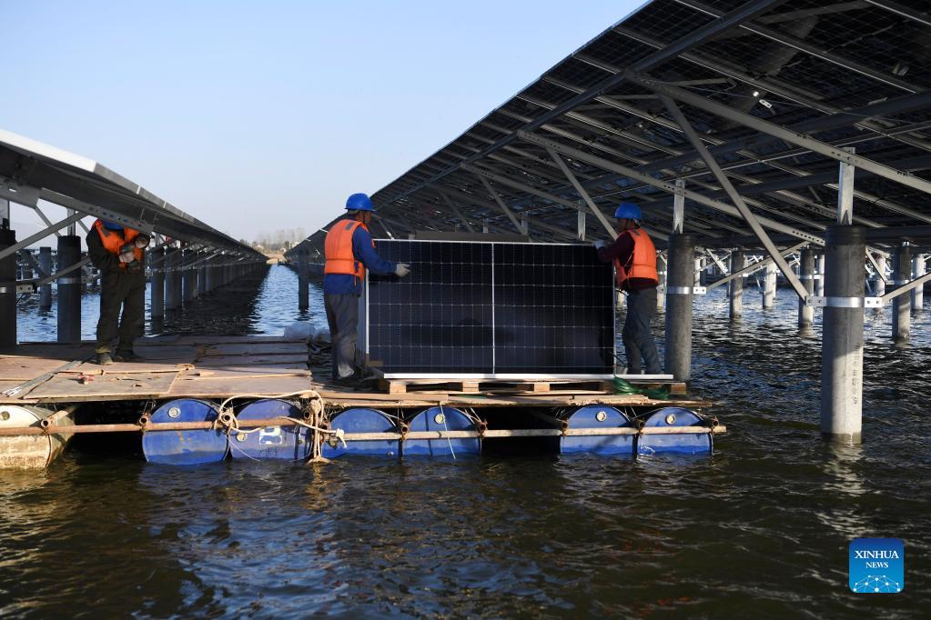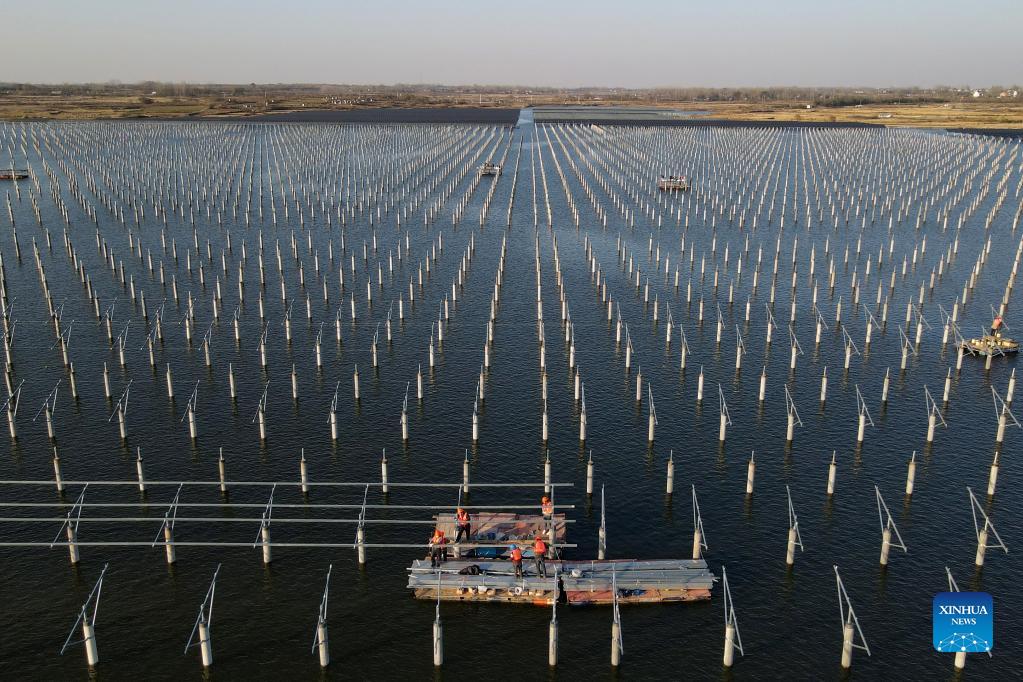 Workers install panels of a photovoltaic (PV) power station at Jiangji reservoir in Feidong County of Hefei, east China's Anhui Province, Nov. 24, 2021. A PV power station with a designed installed capacity of 50 megawatts at Jiangji reservoir in Hefei was successfully connected to the grid on Nov. 30. (Xinhua/Liu Junxi)