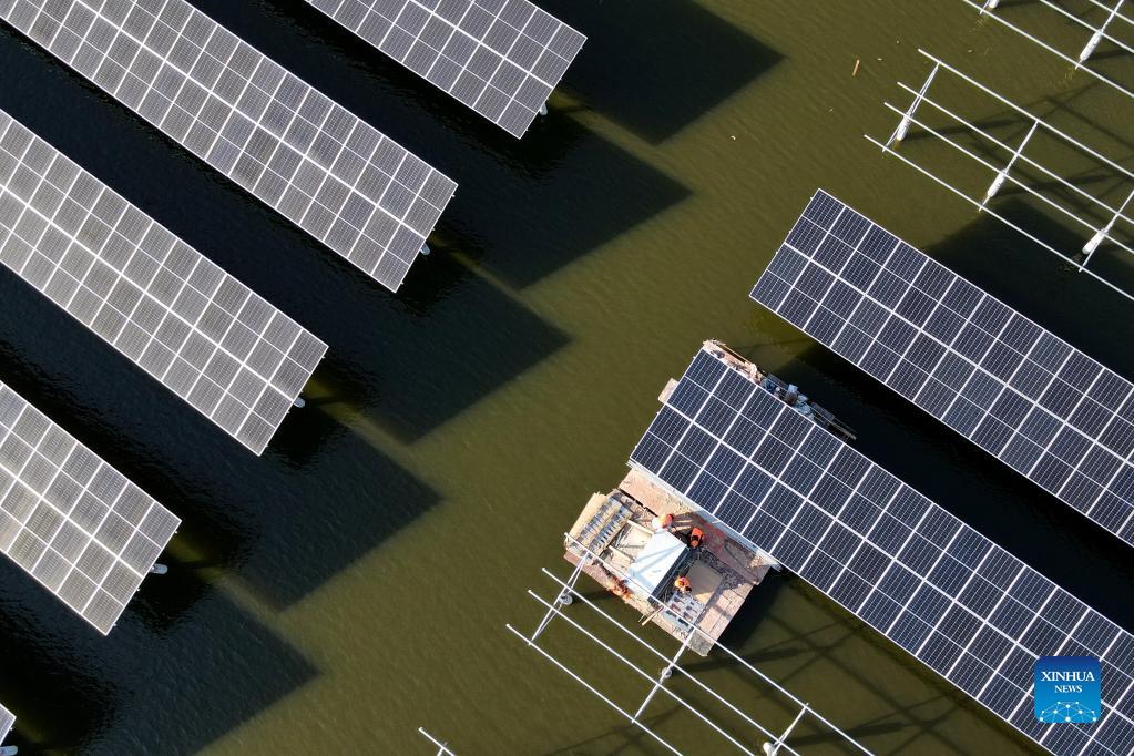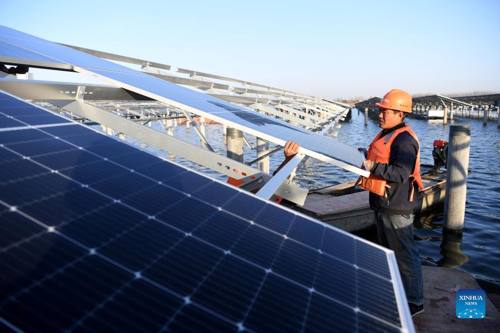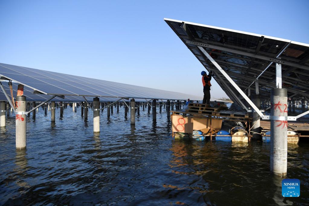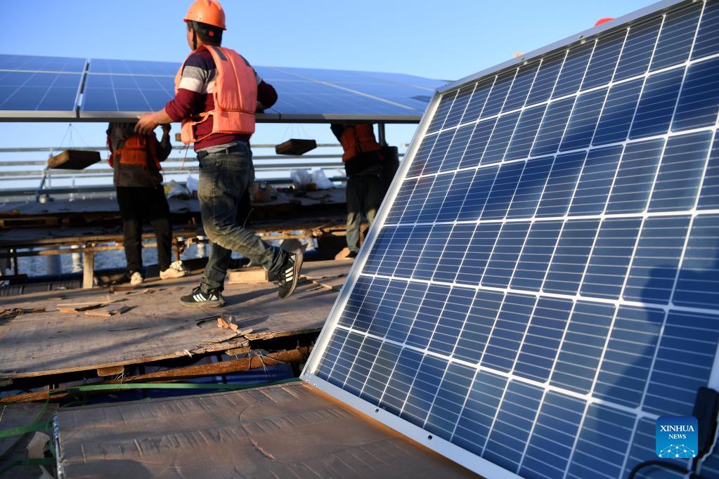 A worker installs panels of a photovoltaic (PV) power station at Jiangji reservoir in Feidong County of Hefei, east China's Anhui Province, Nov. 24, 2021. A PV power station with a designed installed capacity of 50 megawatts at Jiangji reservoir in Hefei was successfully connected to the grid on Nov. 30. (Xinhua/Liu Junxi)