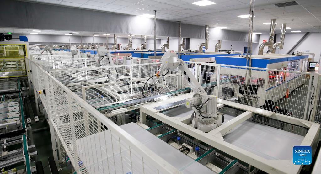 Robotic arms are seen at work on the production line of photovoltaic (PV) panels at a workshop in Hefei, east China's Anhui Province, Nov. 30, 2021. A PV power station with a designed installed capacity of 50 megawatts at Jiangji reservoir in Hefei was successfully connected to the grid on Nov. 30. (Xinhua)
