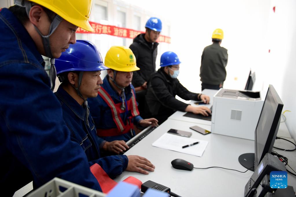 Staff members adjust power supply devices for a photovoltaic (PV) power station before its operation at a transformer substation in Feidong County of Hefei, east China's Anhui Province, Nov. 30, 2021. A PV power station with a designed installed capacity of 50 megawatts at Jiangji reservoir in Hefei was successfully connected to the grid on Nov. 30. (Xinhua/Huang Bohan)