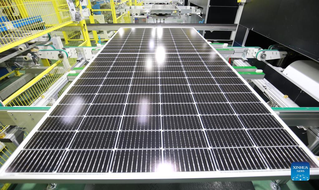 Photo taken on Nov. 30, 2021 shows a production line of photovoltaic (PV) panels at a workshop in Hefei, east China's Anhui Province. A PV power station with a designed installed capacity of 50 megawatts at Jiangji reservoir in Hefei was successfully connected to the grid on Nov. 30. (Xinhua)