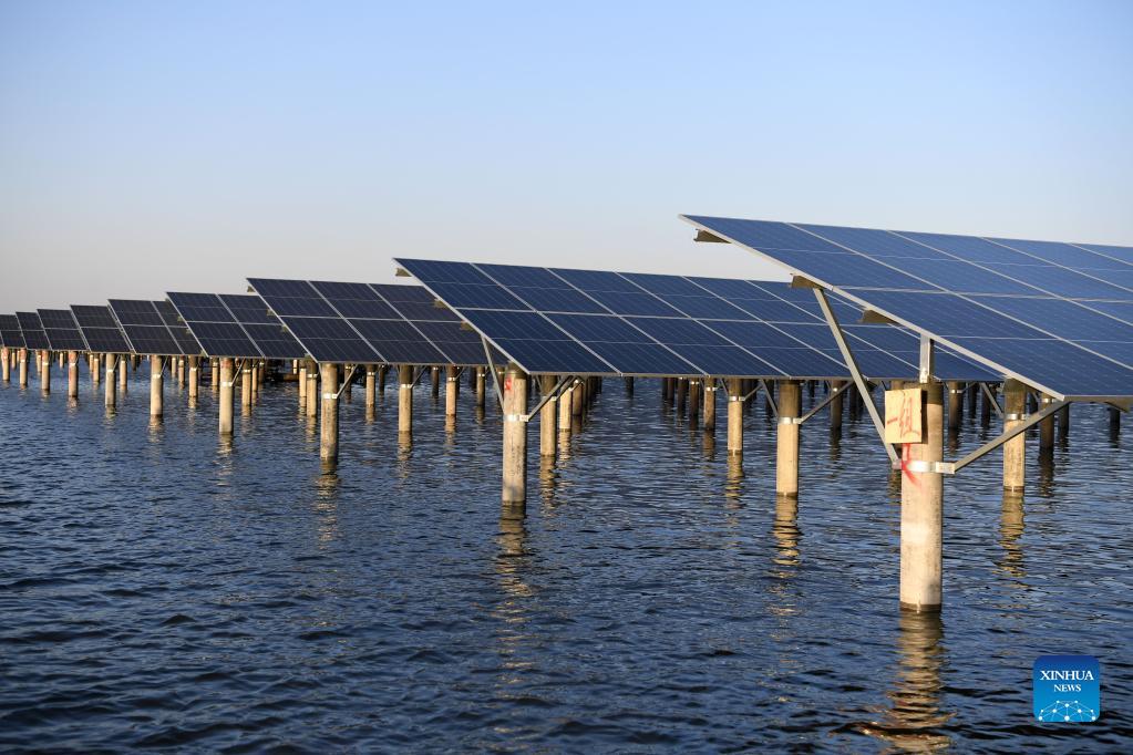 Photo taken on Nov. 24, 2021 shows a photovoltaic (PV) power station at Jiangji reservoir in Feidong County of Hefei, east China's Anhui Province. A PV power station with a designed installed capacity of 50 megawatts at Jiangji reservoir in Hefei was successfully connected to the grid on Nov. 30. (Xinhua/Liu Junxi)