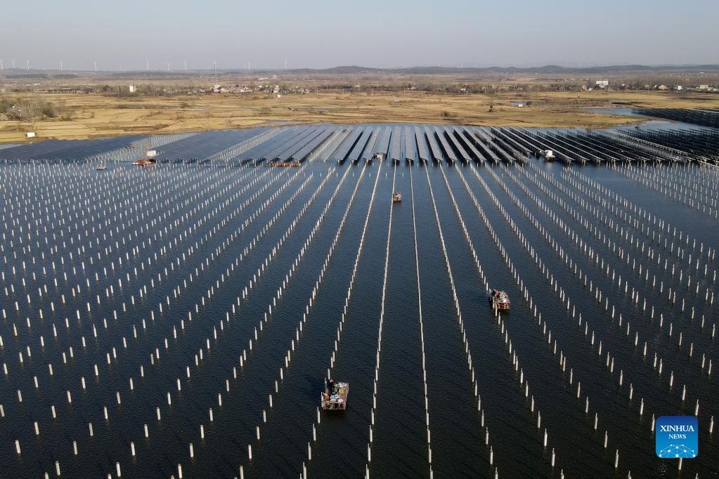 Aerial photo taken on Nov. 24, 2021 shows a photovoltaic (PV) power station at Jiangji reservoir in Feidong County of Hefei, east China's Anhui Province. A PV power station with a designed installed capacity of 50 megawatts at Jiangji reservoir in Hefei was successfully connected to the grid on Nov. 30. (Xinhua/Huang Bohan)