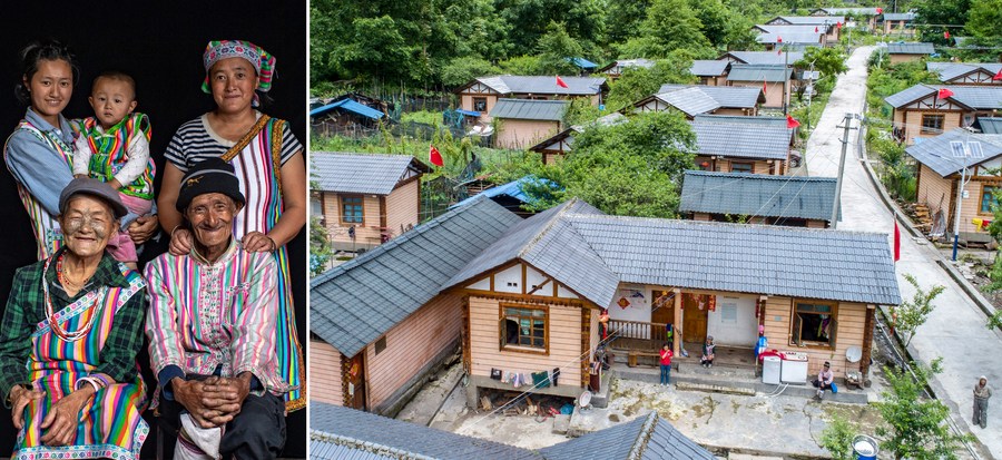 Combo photo taken on June 21, 2019 shows a family photo of Li Wenshi (L front), a woman of Dulong ethnic group, and houses of Li and other villagers in Dizhengdang Village of Dulongjiang Township, Gongshan County, southwest China's Yunnan Province. The houses were built in 2011 by local government.(Xinhua/Jiang Wenyao)