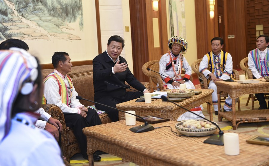 Chinese President Xi Jinping (4th R) meets with representatives from Gongshan Dulong and Nu Autonomous County of the Nujiang Lisu Autonomous Prefecture, in Kunming, capital of southwest China's Yunnan Province, Jan. 20, 2015. Xi made an inspection tour in Yunnan from Jan. 19 to 21. (Xinhua/Zhang Duo)