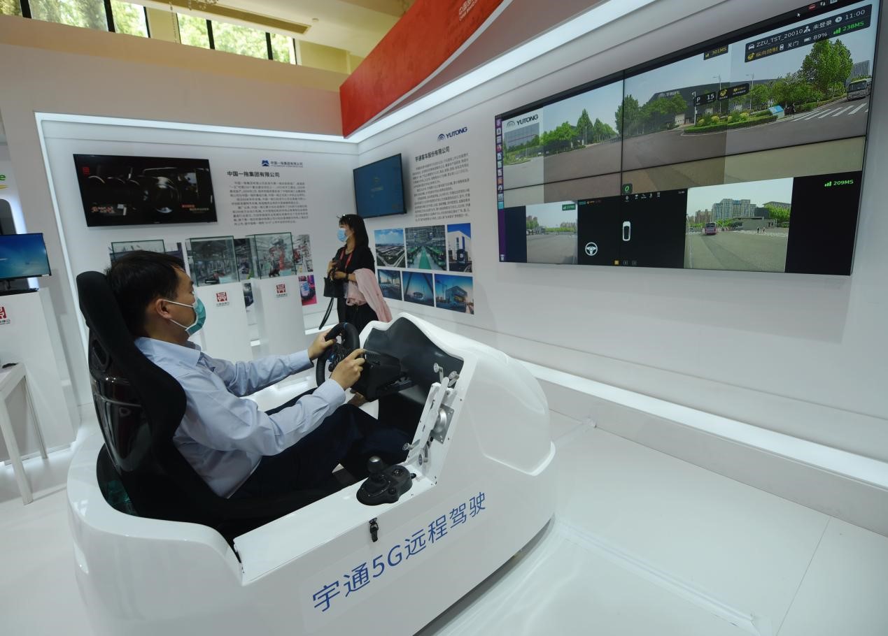 A visitor tries 5G-empowered remote driving technology developed by Chinese bus maker Yutong at the company’s exhibition booth at an expo on China indigenous brands, one of the 2021 China Brand Day events in Shanghai, May 10, 2021. (People’s Daily Online/Long Wei)