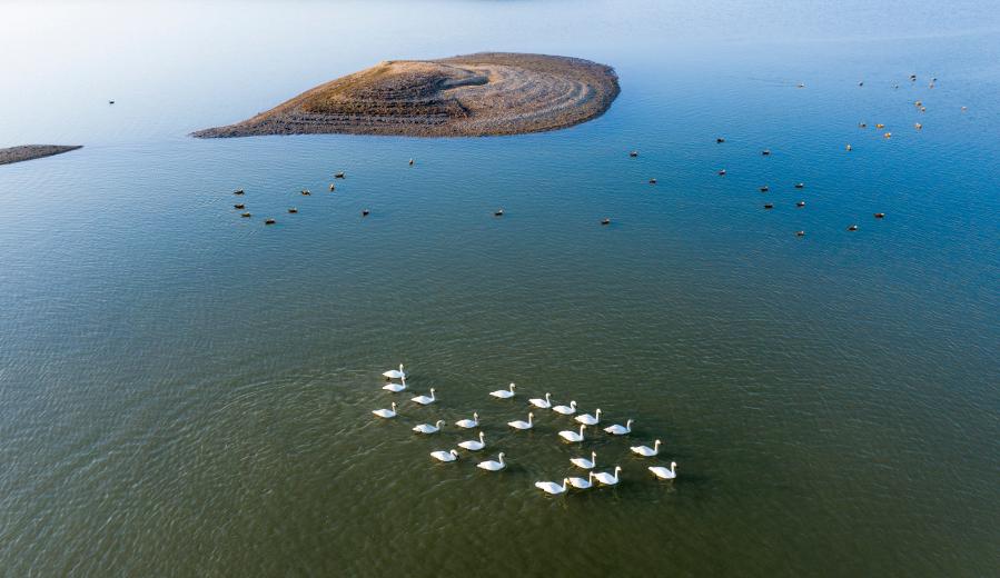 Aerial photo taken on Feb. 21, 2021 shows swans swimming at the Duchang water area of the Poyang Lake, east China's Jiangxi Province. (Xinhua/Fu Jianbin)