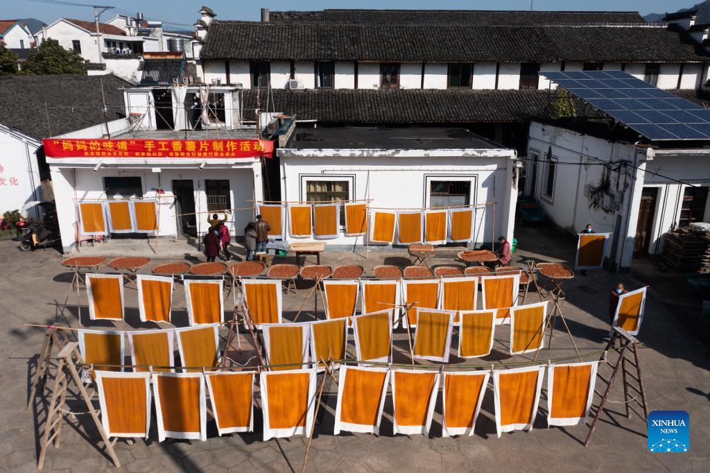 Photo taken on Dec. 1, 2021 shows sweet potato chips in Quanfan Village of Zhaojia Township in Zhuji, east China's Zhejiang Province. Sweet potato planting area in Quanfan Village has reached more than 1,000 mu (about 67 hectares). Every winter, local villagers will make sweet potato delicacies in different ways, among which traditional sweet potato chip is a popular one. (Xinhua/Xu Yu)