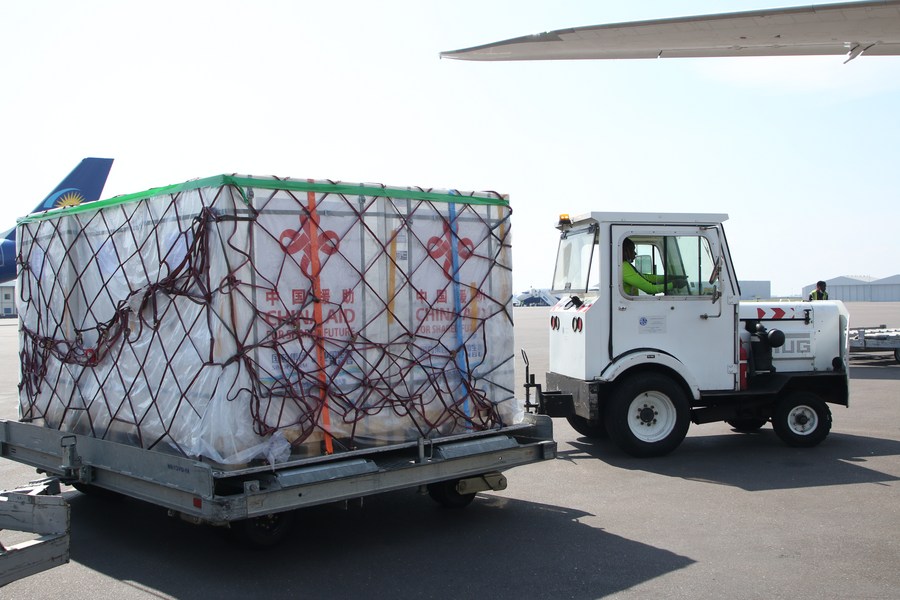 A new batch of Sinopharm COVID-19 vaccine donated by the Chinese government arrives at Kigali International Airport in Kigali, Rwanda, Nov. 7, 2021. (Xinhua/Ji Li)