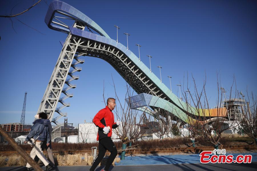 Citizens run under the Shougang Ski Jumping Platform in Beijing, capital of China, Dec. 1, 2021. (Photo: China News Service/Zhao Juan)