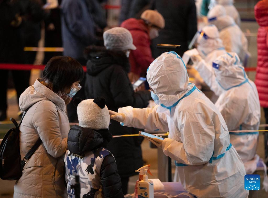 Medical workers register information of residents for nucleic acid testing at a sampling site in Xiangfang District of Harbin City, northeast China's Heilongjiang Province, Dec. 2, 2021. Harbin launched the first round of all-inclusive nucleic acid testing in some areas on Thursday since new locally transmitted confirmed COVID-19 cases were reported. (Xinhua/Zhang Tao)