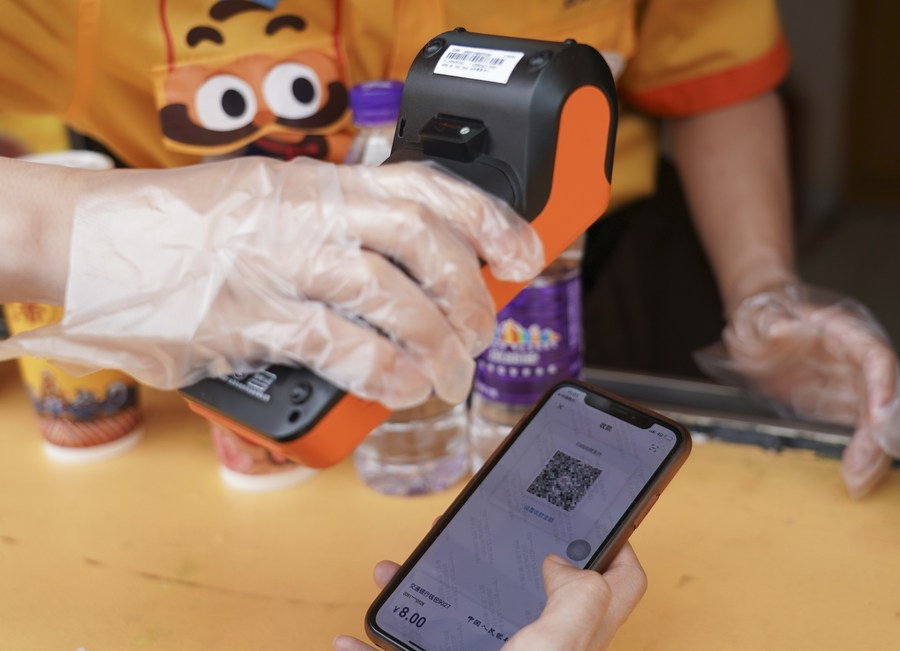 A staff member receives money from a tourist using digital RMB with a POS reader at the Happy Valley Beijing theme park the in Beijing, capital of China, June 16, 2021. (Xinhua/Chen Zhonghao)