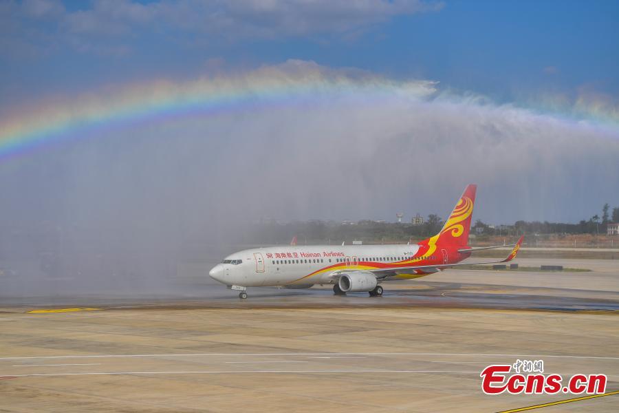 Hainan Airlines flight HU7372 passes through the "water salute," a tradition used for ceremonial purposes, at the Haikou Meilan International Airport in Haikou, the capital city of south China's Hainan Province. (Photo: China News Service/Luo Yunfei)