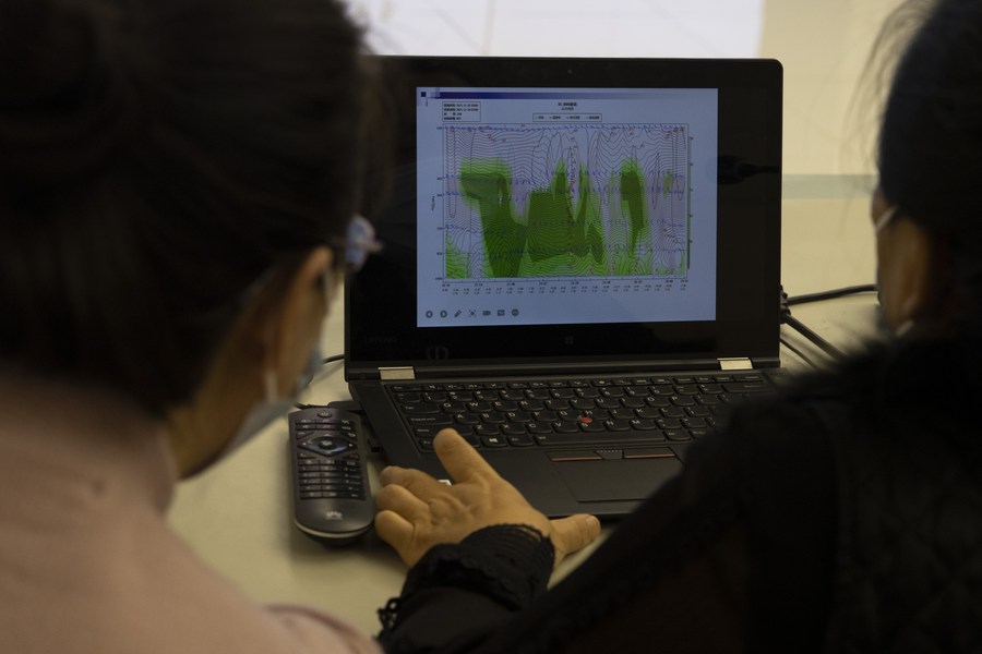 Meteorological bureau staff members monitor weather conditions in Jixi, northeast China's Heilongjiang Province, Nov. 21, 2021. (Xinhua/Zhang Tao)