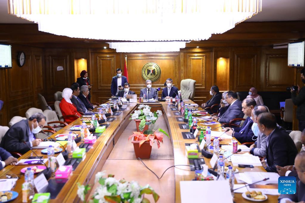 Photo taken on Nov. 30, 2021 shows the virtual signing ceremony of a memorandum of understanding to establish a joint laboratory for smart agriculture between Egypt and China, in Cairo, Egypt. The agreement, which calls for establishing a joint lab for smart agriculture cooperation, as well as executing important cooperative research projects, holding scientific seminars and conferences, and exchanging visits of professors, lecturers, and students between Egypt and China, was signed between Egypt's National Authority for Remote Sensing and Space Sciences (NARSS), which belongs to the country's Ministry of Higher Education and Scientific Research, and China's Institute of Agricultural Resources and Regional Planning (IARRP) of the Chinese Academy of Agricultural Sciences (CAAS), said the Chinese embassy. (Photo by Ahmed Gomaa/Xinhua)