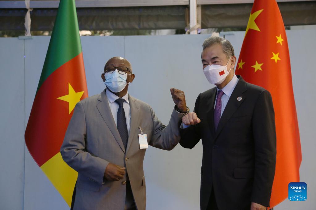 Chinese State Councilor and Foreign Minister Wang Yi (R) meets with Cameroon's Foreign Minister Lejeune Mbella Mbella on the sidelines of the Eighth Ministerial Conference of the Forum on China-Africa Cooperation in Dakar, Senegal, Nov. 30, 2021. (Xinhua/Cao Kai)