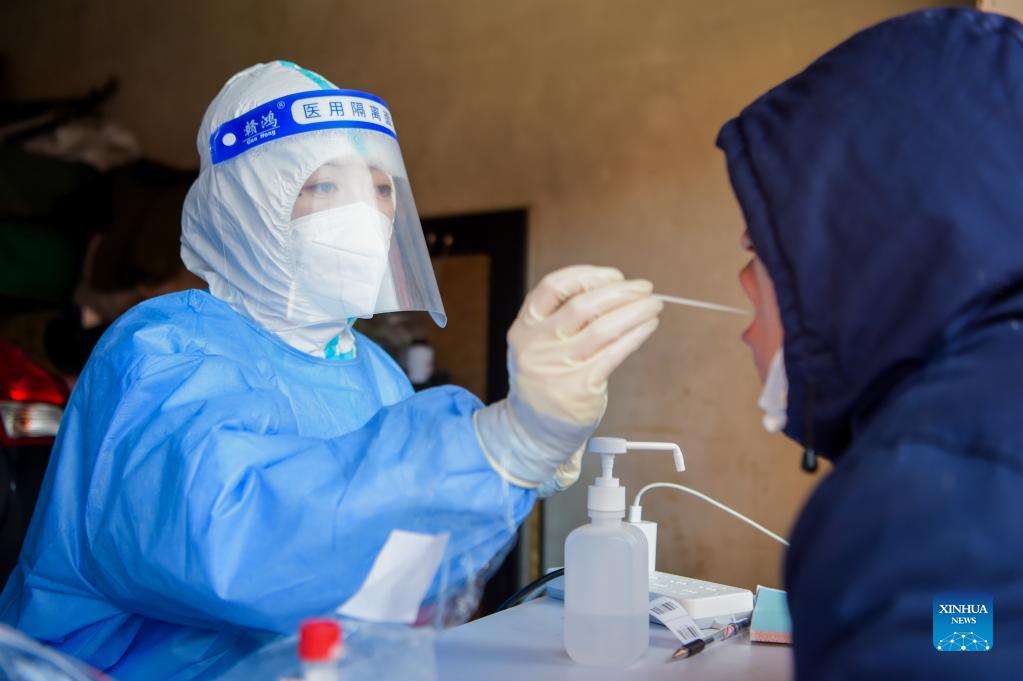 A medical worker takes a swab sample from a resident for nucleic acid testing at a sampling site in Manzhouli, north China's Inner Mongolia Autonomous Region, Dec. 1, 2021.Xinhua/Li Zhipeng)